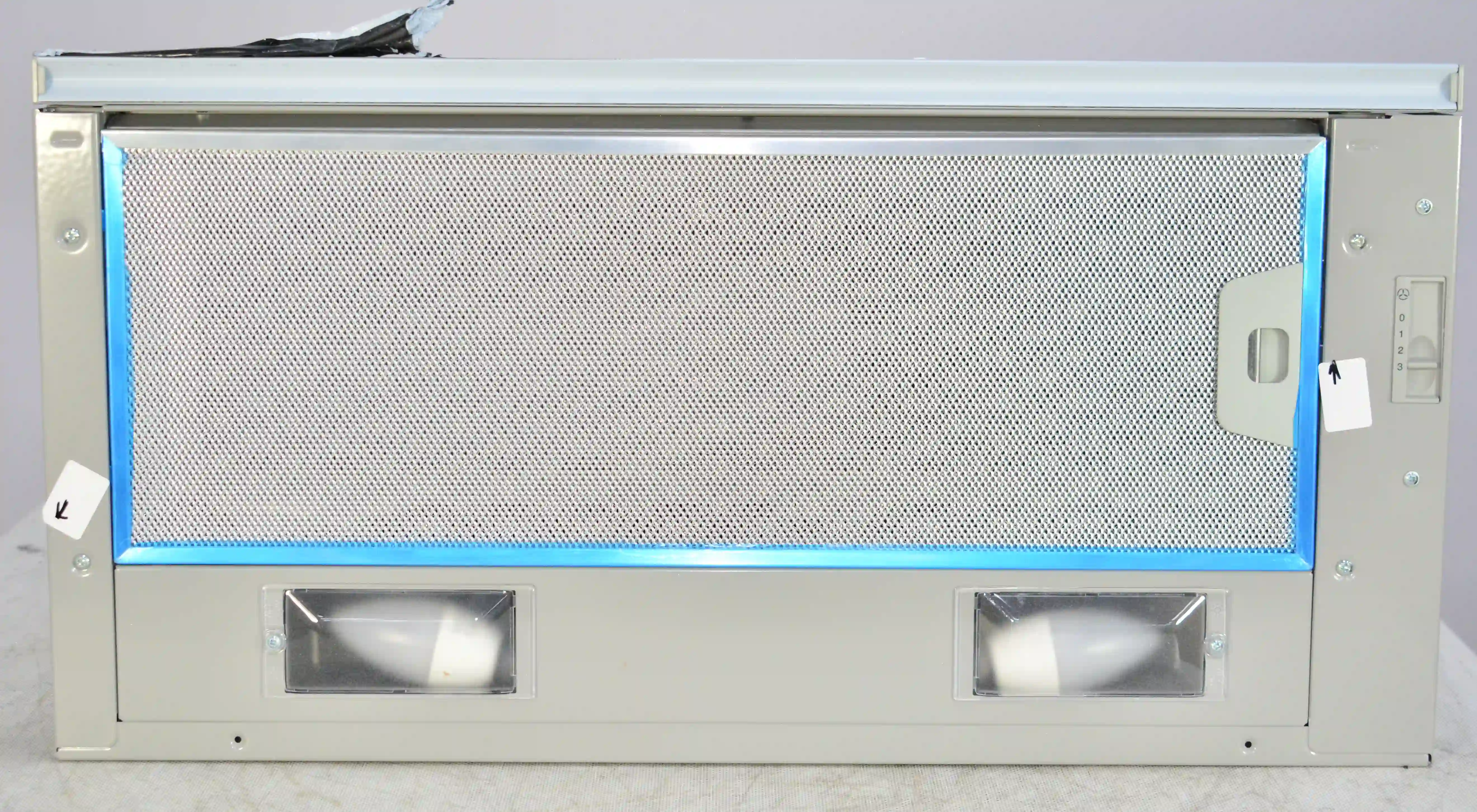 На корпусе из нержавеющей стали предусмотрен ползунковый переключатель для выбора скорости работы мотора. Две LED-лампы мощностью 4Вт обеспечивают освещение варочной панели в любое время суток. Для активации двигателя достаточно выдвинуть внутреннюю стеклянную панель. Встроенный антивозвратный клапан исключает проникновение неприятного запаха из вентиляции обратно в комнату.
