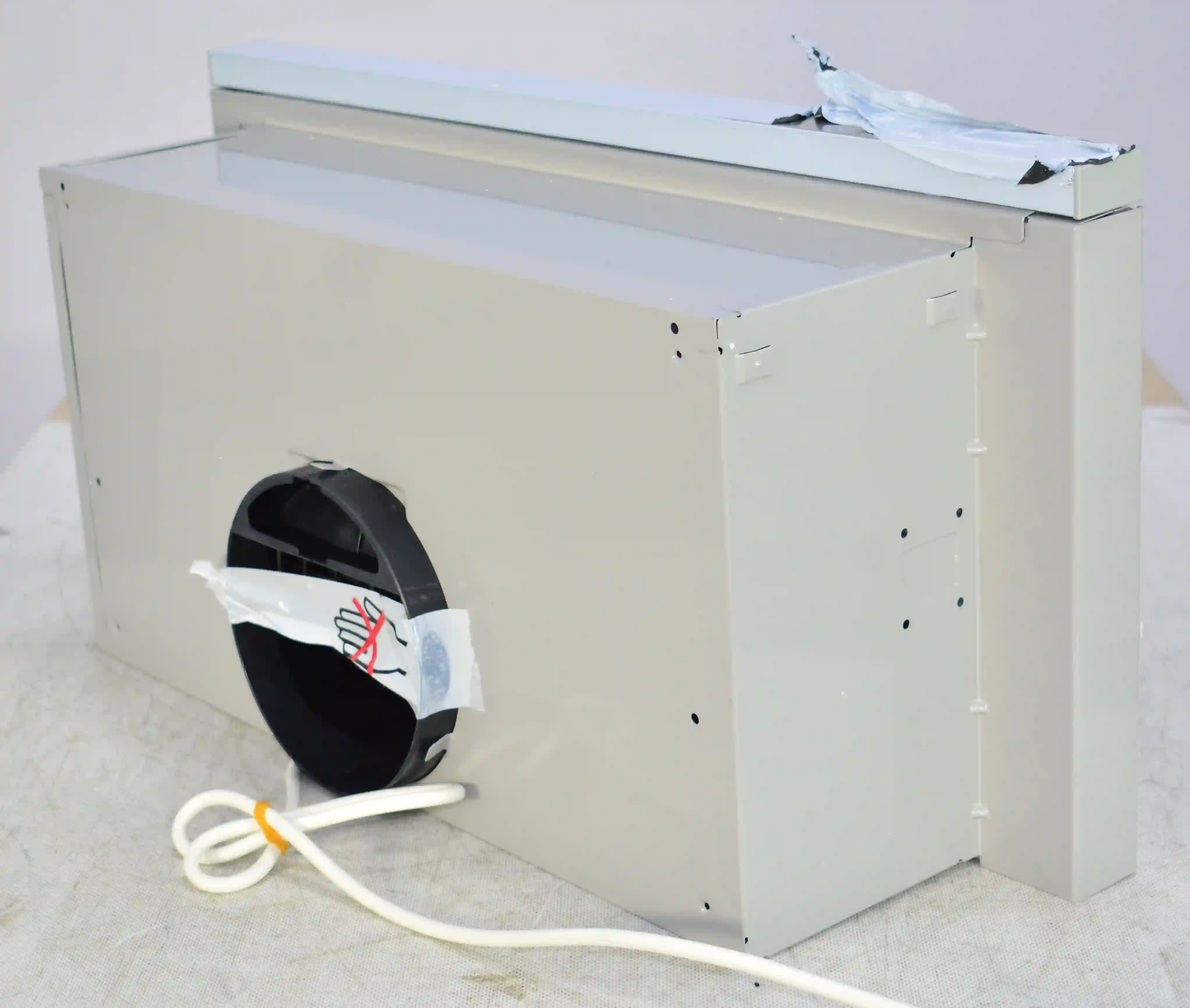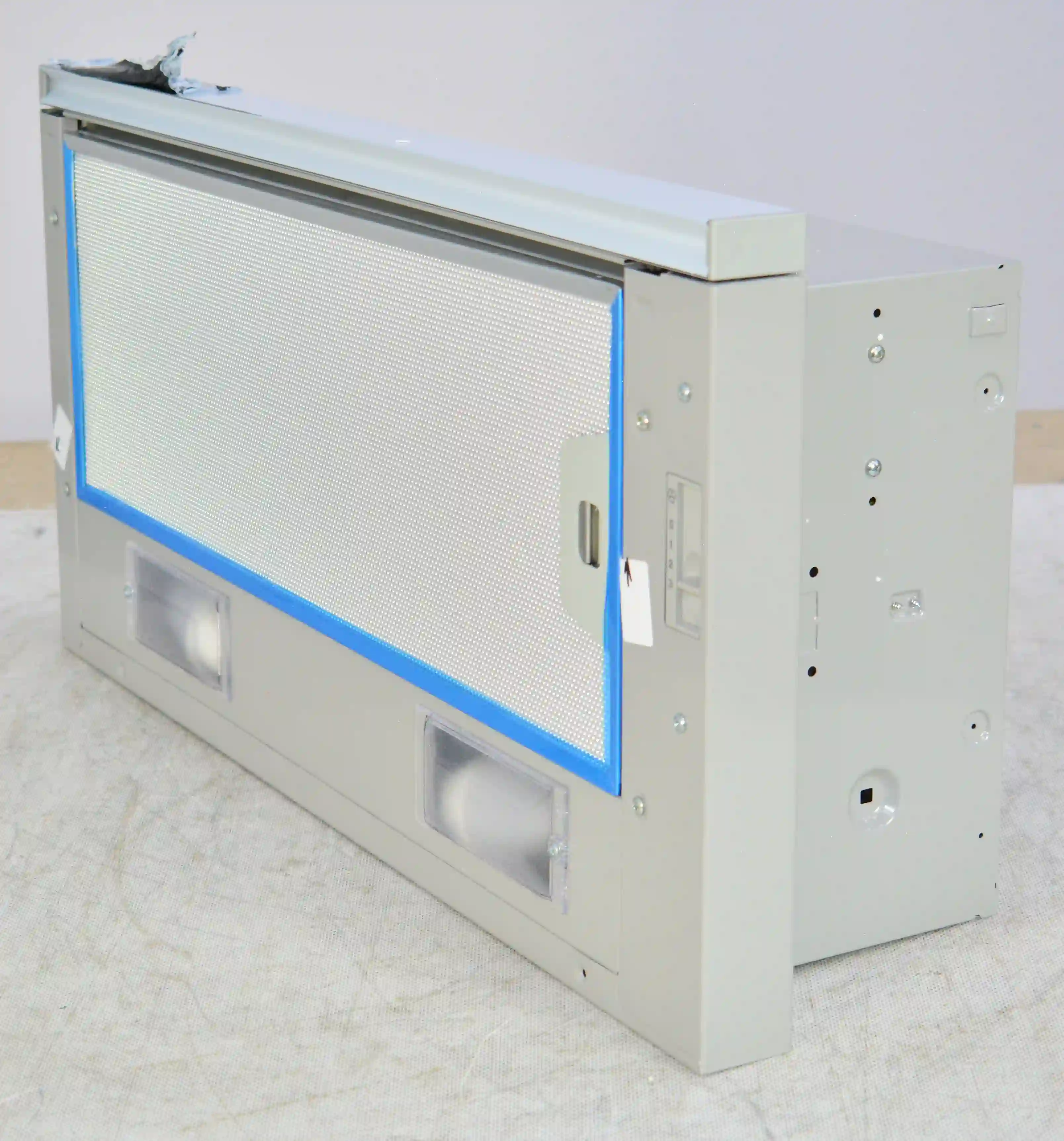 Для установки корпуса размером 13,5х60х28 см в навесной шкаф не требуется использование дополнительных приспособлений. Для подключения устройства к электросети с напряжением 220-240 В предусмотрен кабель длиной 1,3 м. Диаметр воздуховода составляет 150 мм. Съемный жироулавливающий сетчатый фильтр изготовлен из металла и очищается от налета с помощью воды, губки или щетки, моющего средства. Потребляемая мощность вытяжки равна 125 Вт.