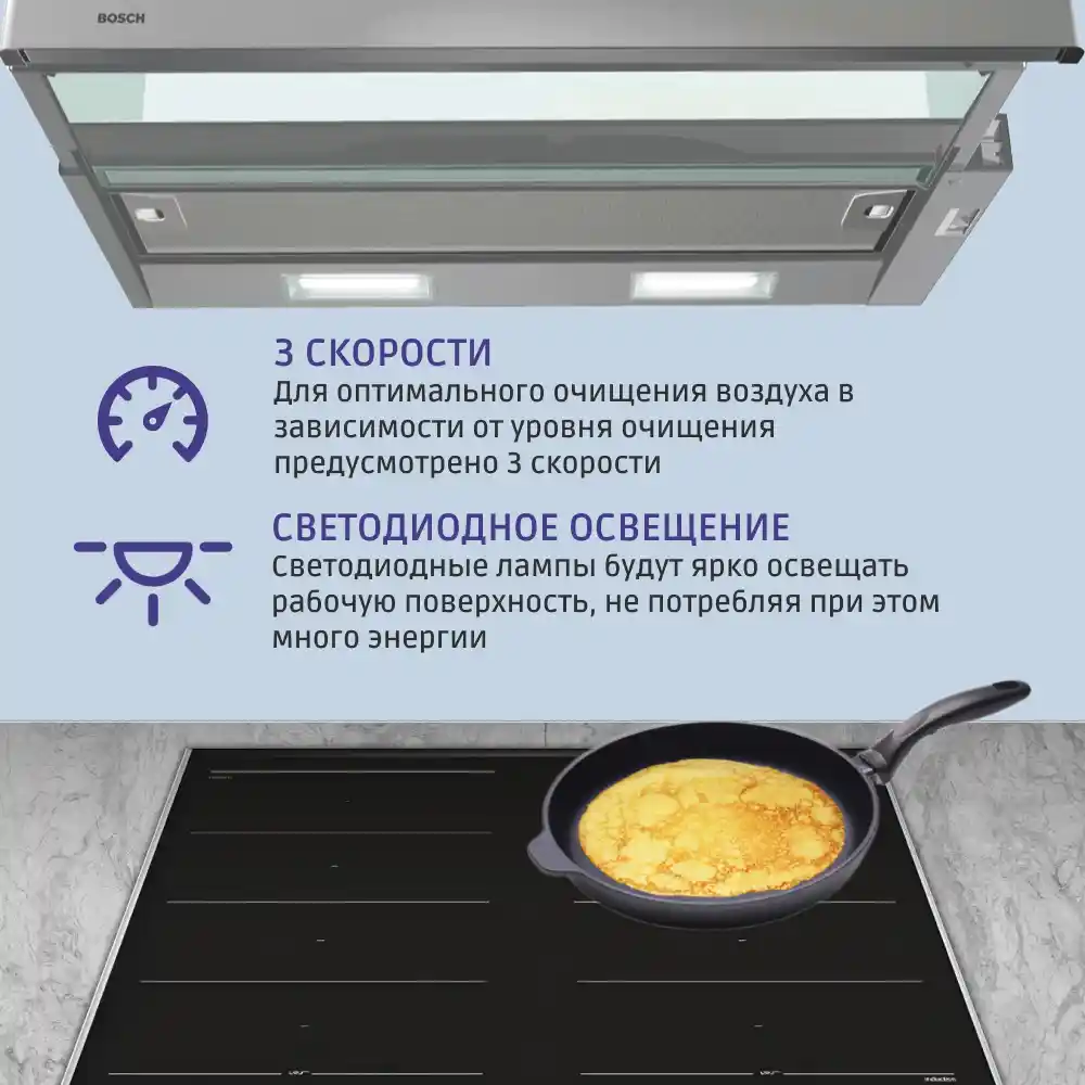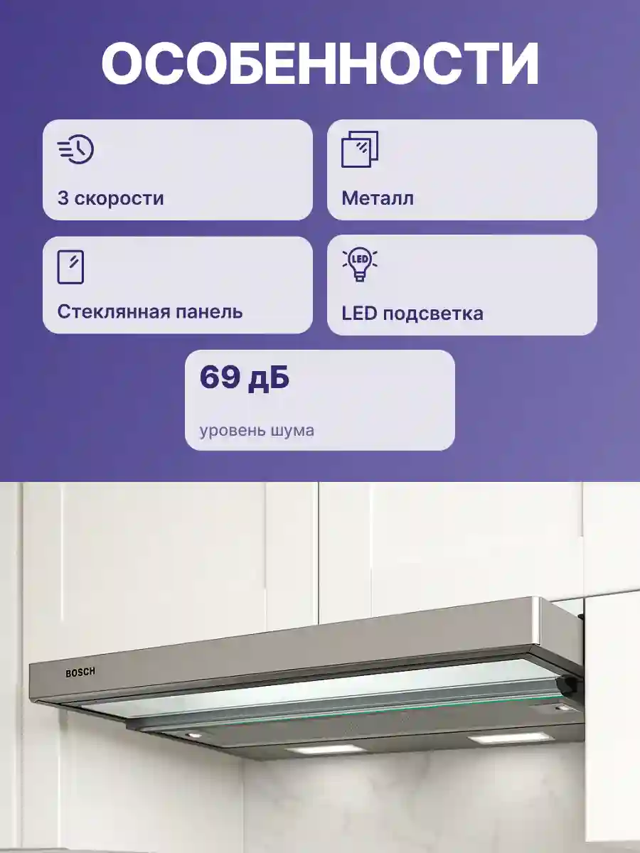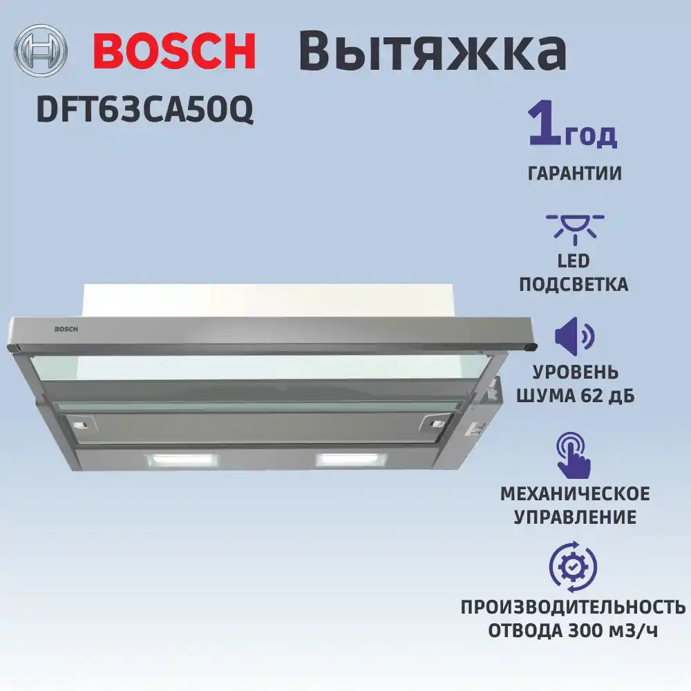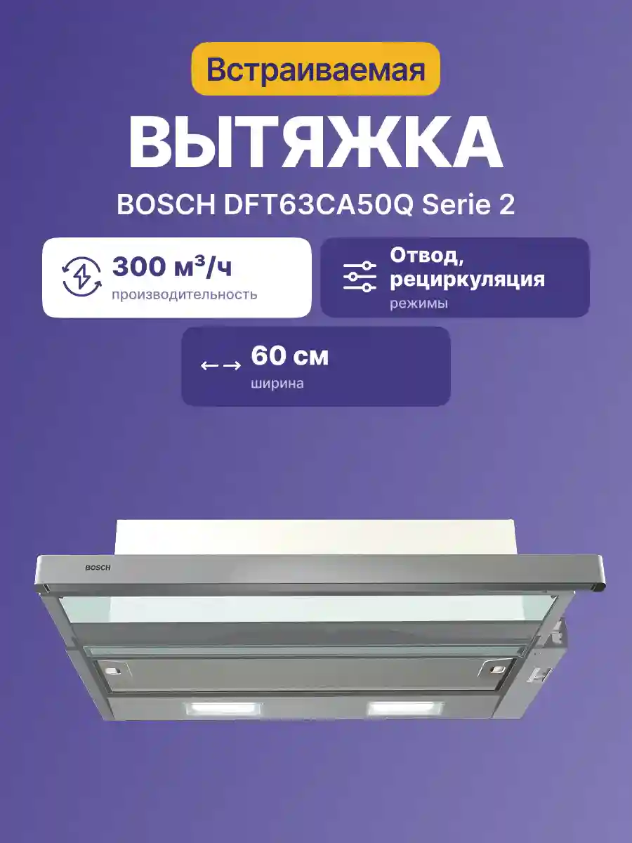 Встраиваемая вытяжка BOSCH DFT63CA50Q Serie 2 сочетается с современным стилем на кухне и обеспечивает быстрое и эффективное устранение неприятного запаха.