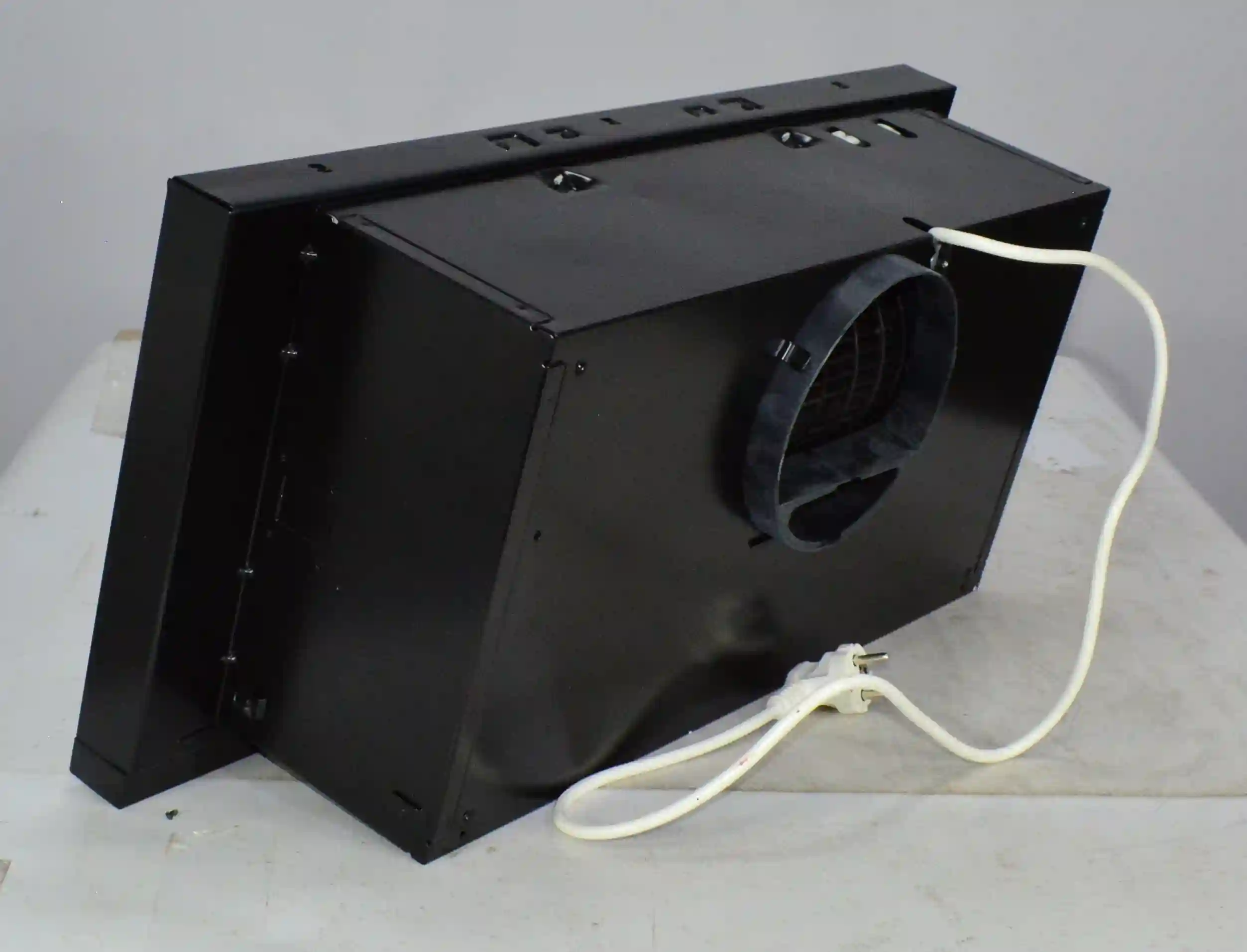 Для установки корпуса размером 13,5х60х28 см в навесной шкаф не требуется использование дополнительных приспособлений. Для подключения устройства к электросети с напряжением 220-240 В предусмотрен кабель длиной 1,3 м. Диаметр воздуховода составляет 150 мм. Съемный жироулавливающий сетчатый фильтр изготовлен из металла и очищается от налета с помощью воды, губки или щетки, моющего средства. Потребляемая мощность вытяжки равна 125 Вт.
