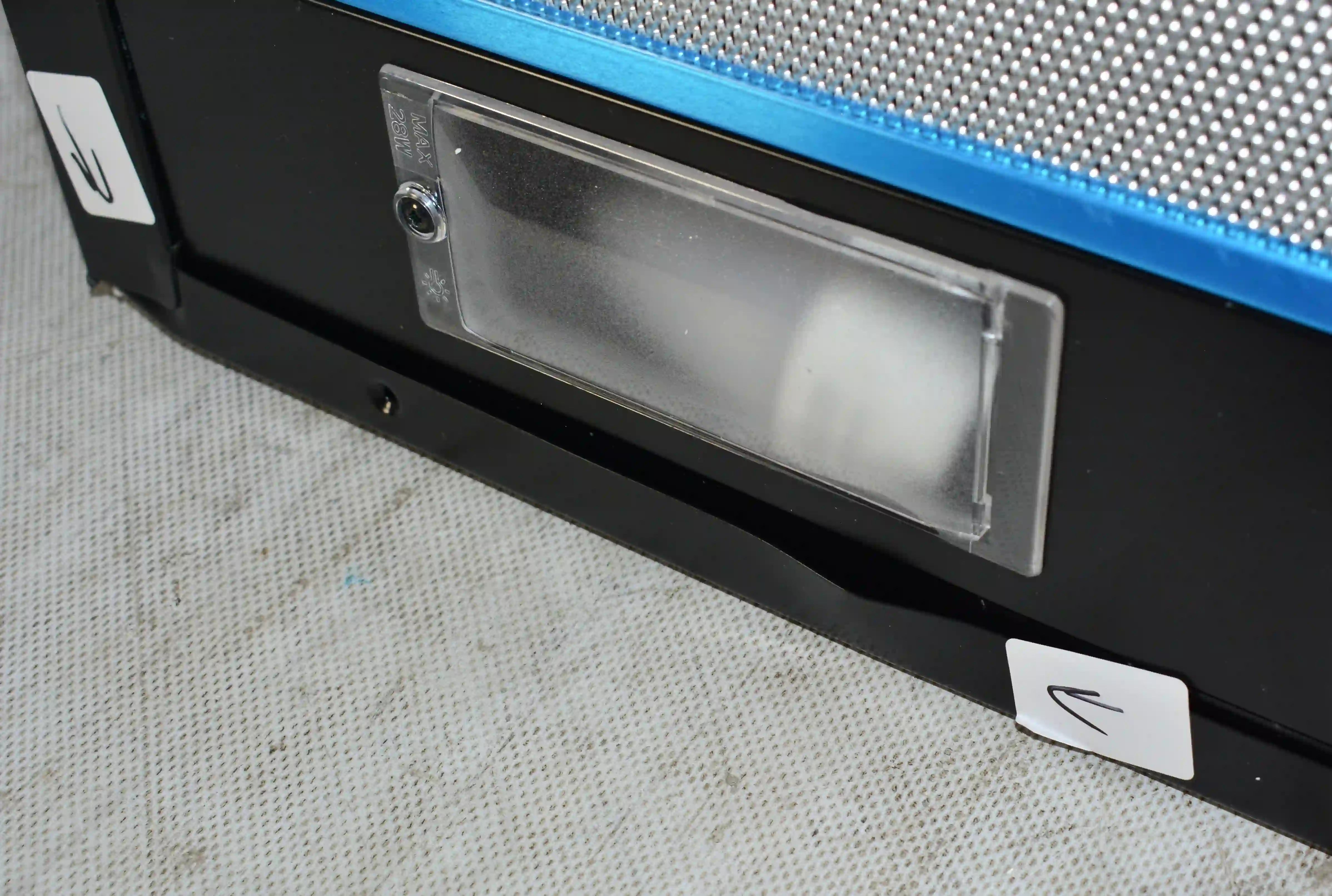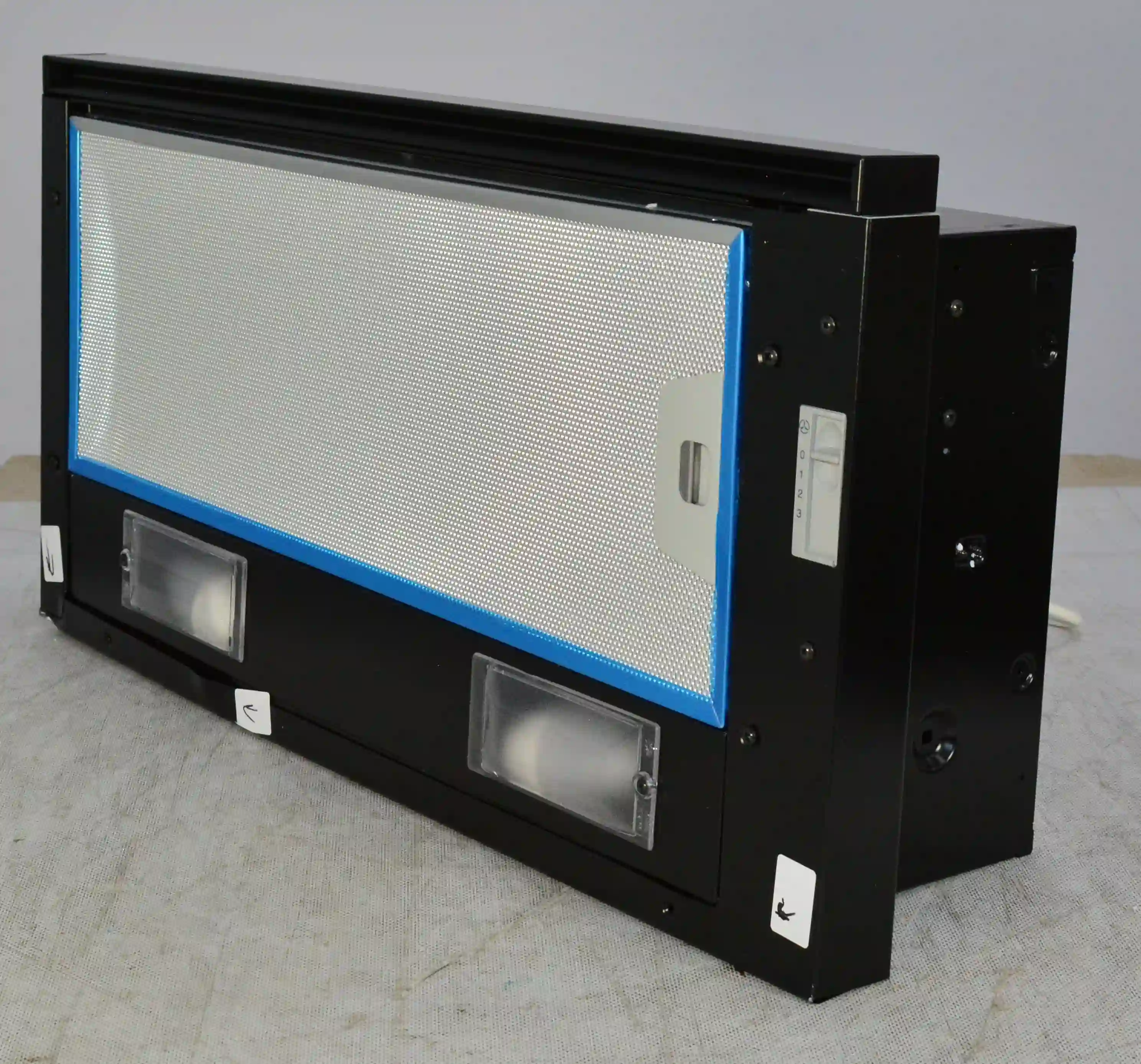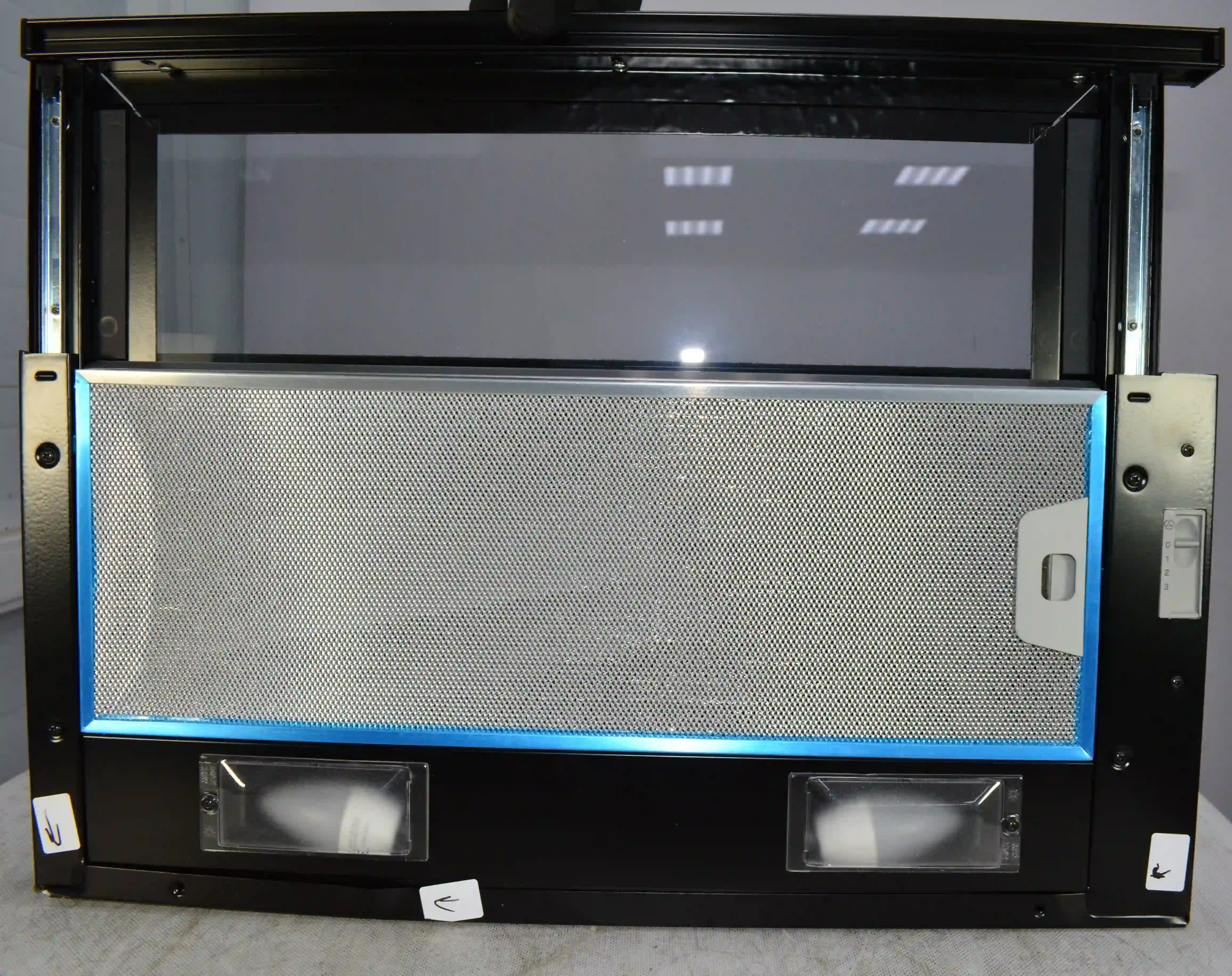 На корпусе из нержавеющей стали предусмотрен ползунковый переключатель для выбора скорости работы мотора. Две LED-лампы мощностью 4Вт обеспечивают освещение варочной панели в любое время суток. Для активации двигателя достаточно выдвинуть внутреннюю стеклянную панель. Встроенный антивозвратный клапан исключает проникновение неприятного запаха из вентиляции обратно в комнату.