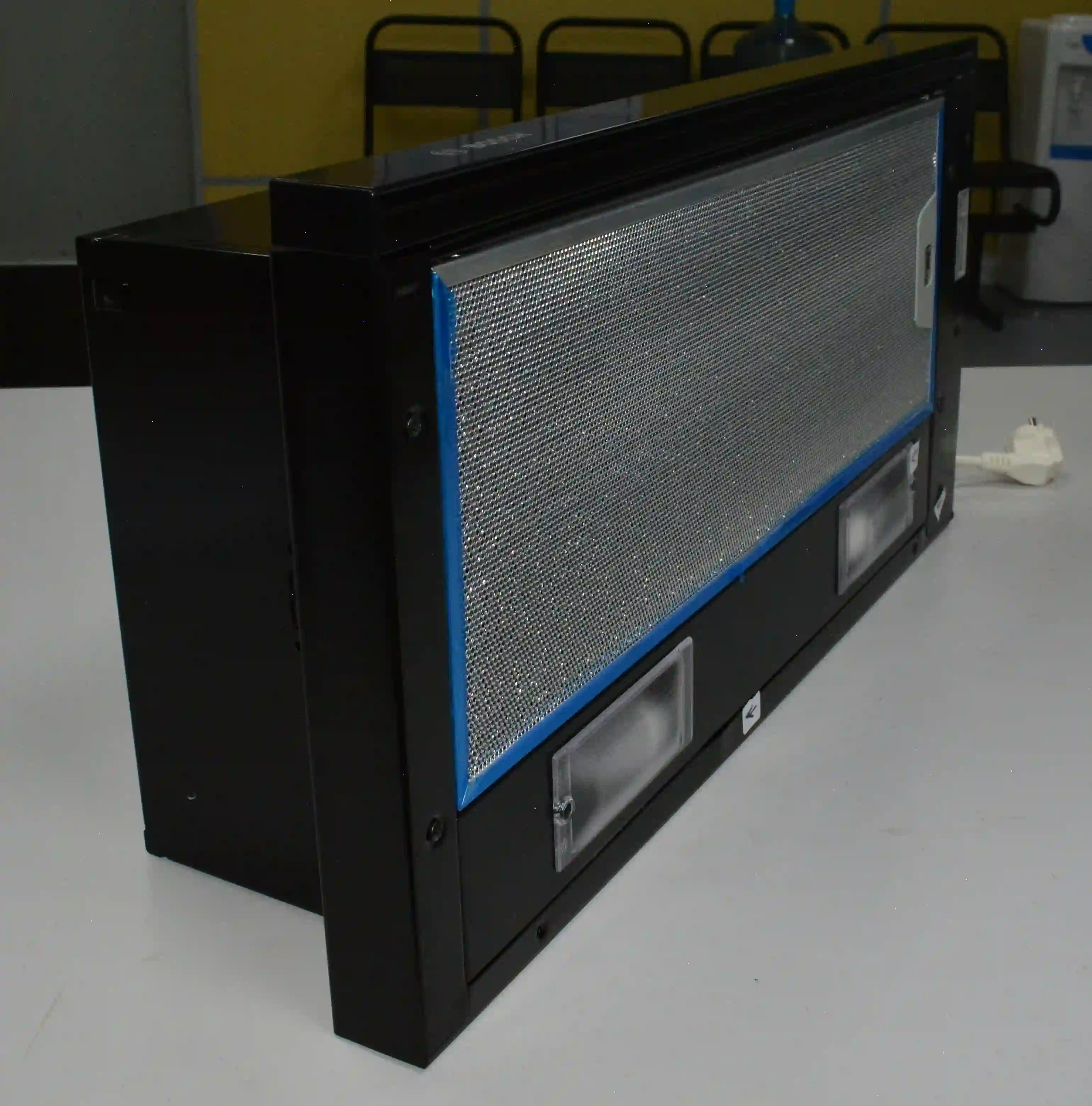 Для установки корпуса размером 13,5х60х28 см в навесной шкаф не требуется использование дополнительных приспособлений. Для подключения устройства к электросети с напряжением 220-240 В предусмотрен кабель длиной 1,3 м. Диаметр воздуховода составляет 150 мм. Съемный жироулавливающий сетчатый фильтр изготовлен из металла и очищается от налета с помощью воды, губки или щетки, моющего средства. Потребляемая мощность вытяжки равна 125 Вт.