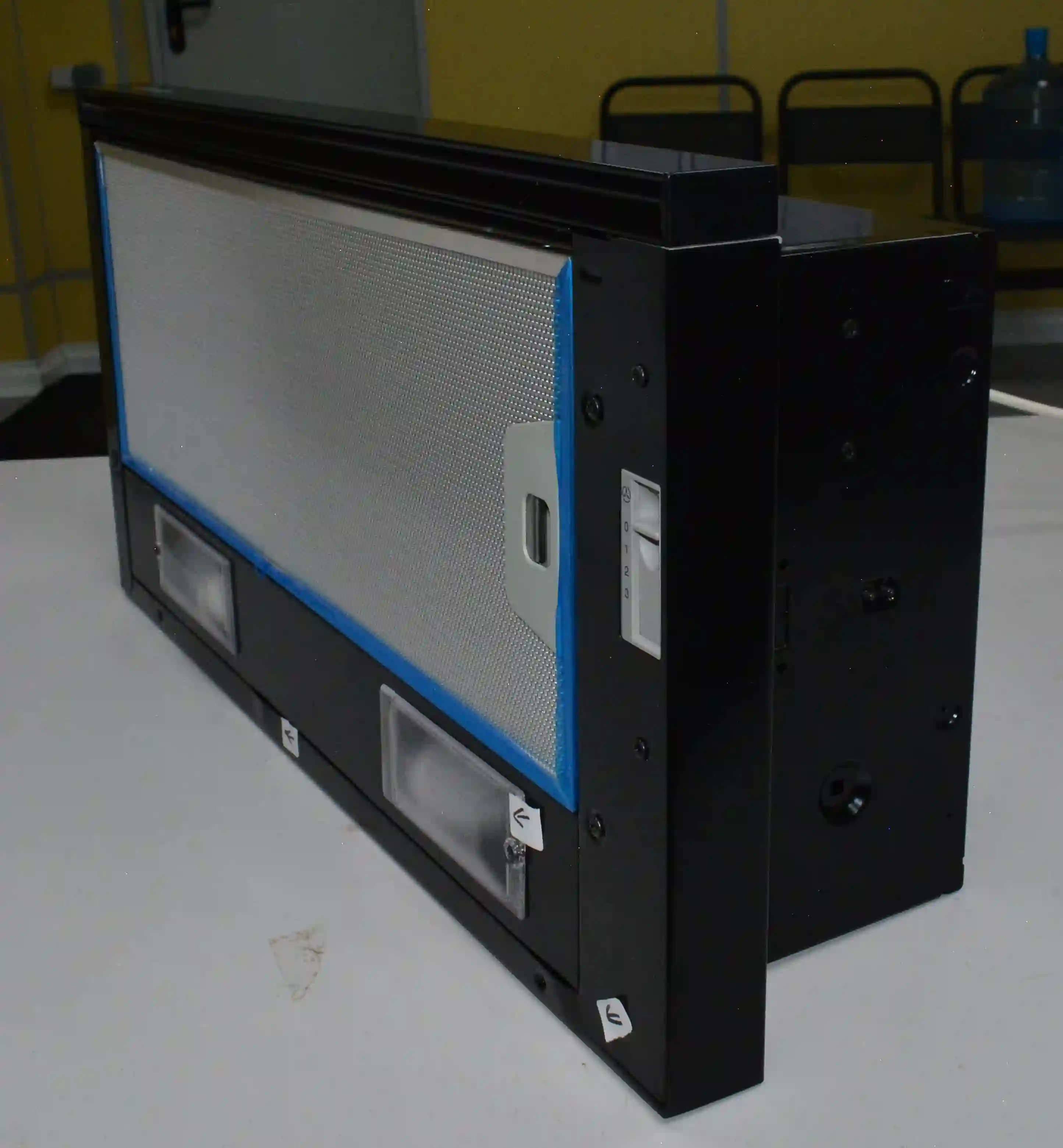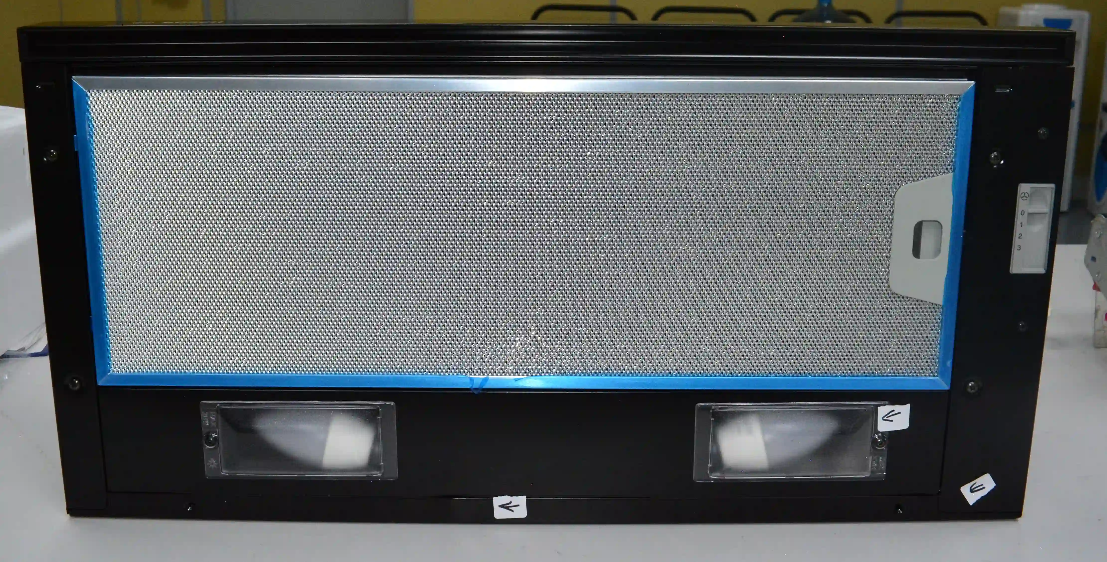 На корпусе из нержавеющей стали предусмотрен ползунковый переключатель для выбора скорости работы мотора. Две LED-лампы мощностью 4Вт обеспечивают освещение варочной панели в любое время суток. Для активации двигателя достаточно выдвинуть внутреннюю стеклянную панель. Встроенный антивозвратный клапан исключает проникновение неприятного запаха из вентиляции обратно в комнату.