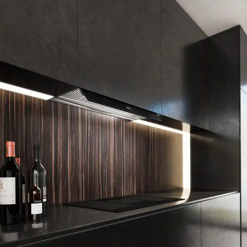 Модель выполнена в классическом черном цвете с металлическими элементами, что позволяет ей гармонично вписаться в большинство кухонных интерьеров. Благодаря встраиваемой конструкции вытяжка монтируется в навесной шкаф, сохраняя эстетику кухонного гарнитура.