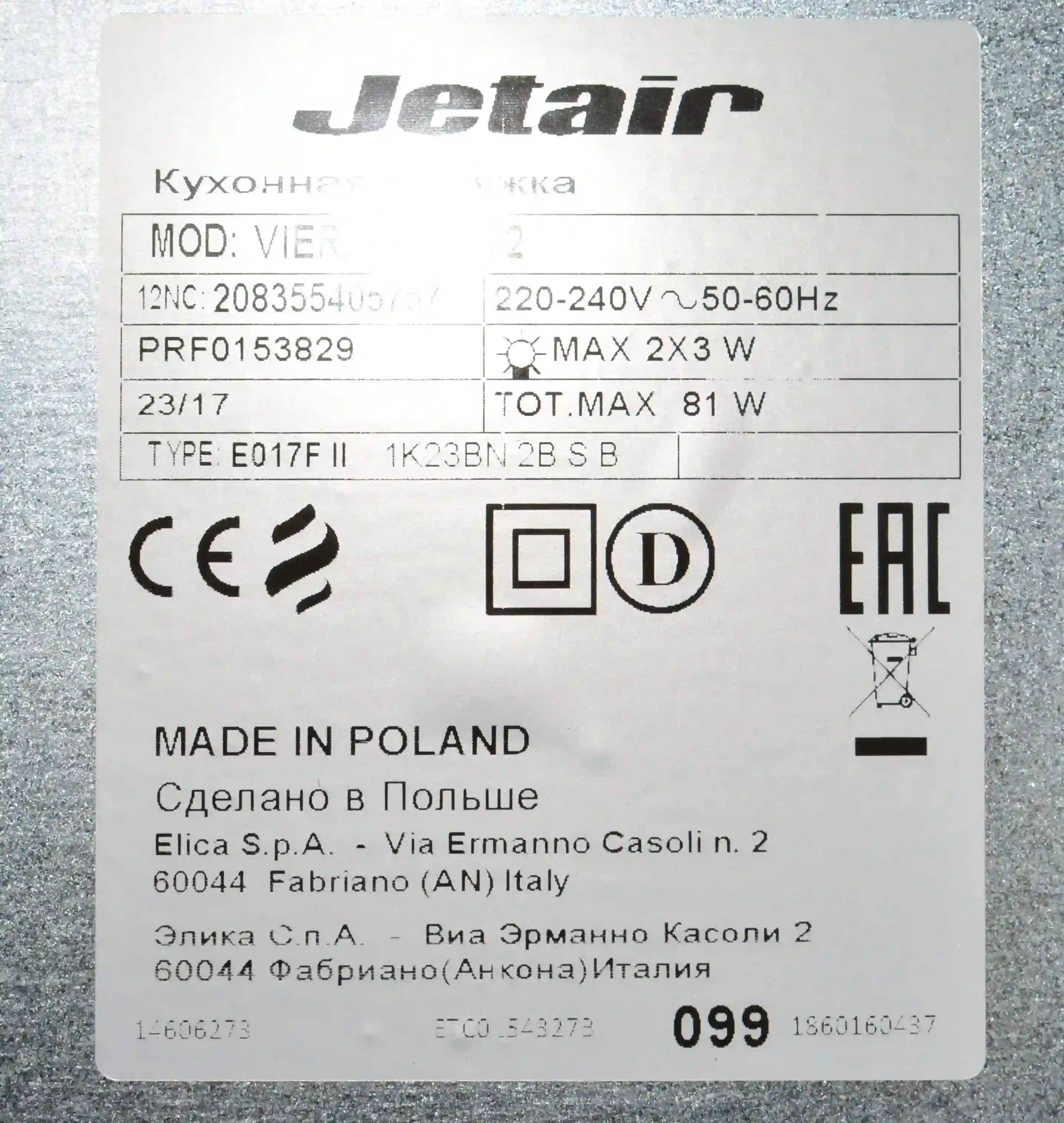 Встраиваемая вытяжка JET AIR VIERA GR/A/72-PRF0153829 k6 000076127