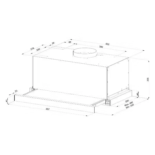 Вытяжка имеет компактные габариты 55.2x25.5x28 см, что позволяет легко встроить её даже в небольшие кухонные шкафы. Компактные размеры делают её идеальным выбором для городских квартир или кухонь с ограниченным пространством, где важна экономия места.