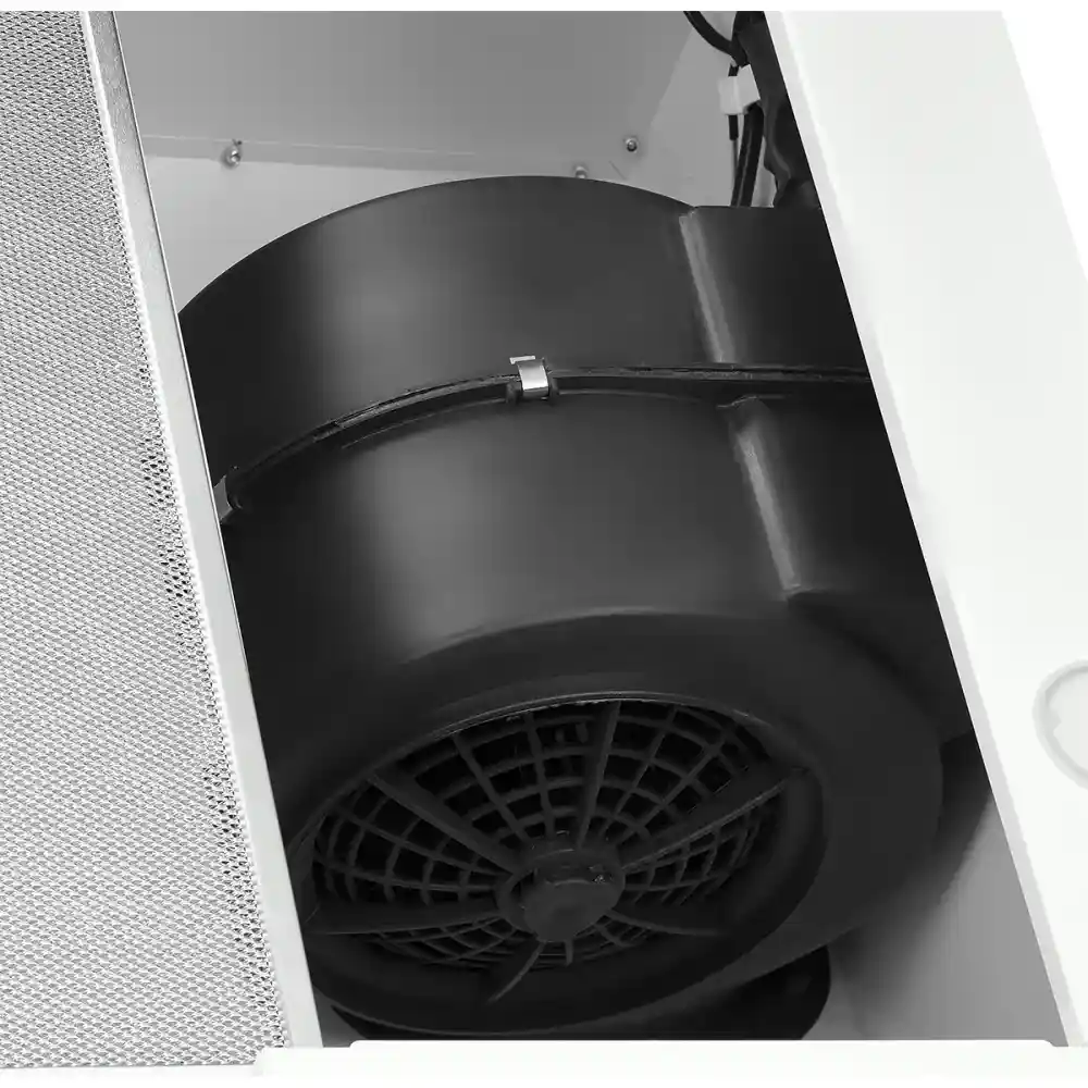 Вытяжка выполнена в белом цвете, что придает ей современный и стильный вид. Белый цвет гармонично вписывается в любой кухонный интерьер, добавляя ему свежести и элегантности. Такой цвет также визуально расширяет пространство, делая кухню более светлой и просторной.